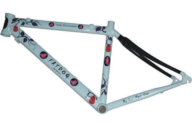 白ベースに、ヘットチューブ&シートステー黒。オリジナルのイラストロゴはカッティングで製作しています。